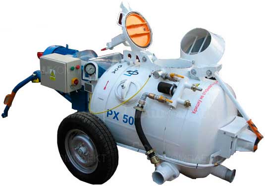 Уникальная конструкция смесительного узла позволяет осуществить перемешивание раствора менее чем за одну минуту. Смесительные лопатки изготовлены из износостойкой стали и имеют увеличенный ресурс. Подача смесей осуществляется внешним компрессором с требуемой производительностью 6 м3/мин.