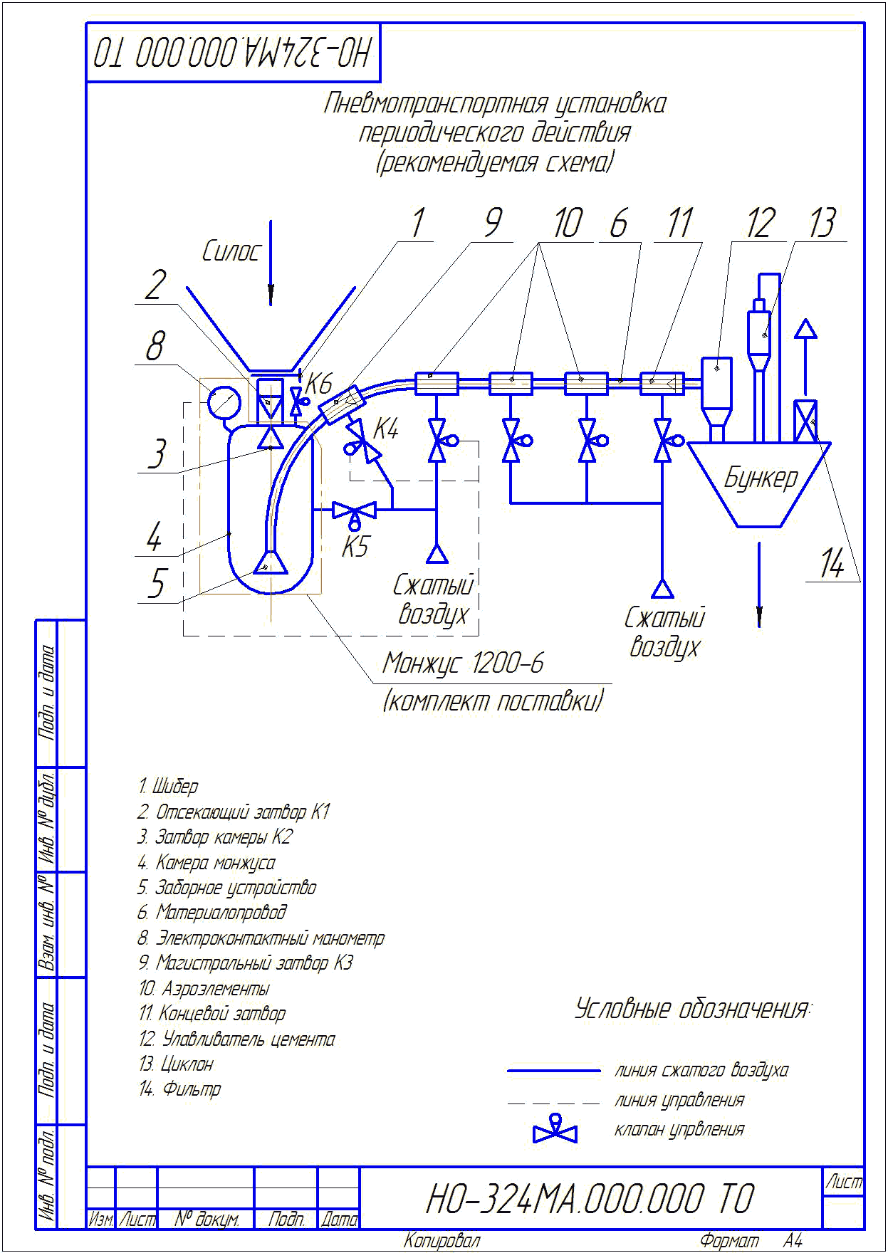 Работа "Монжуса" 1200-6" рассматривается в составе пневмотранспортной установки, выполненной в соответствии с рекомендациями, приведенными на Рис. "Пневмотранспортная установка периодического действия (рекомендуемая схема)".